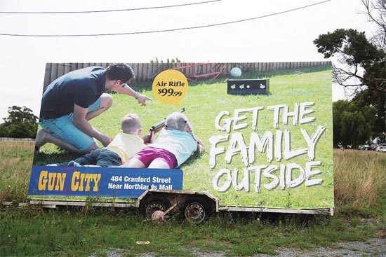 3月18日,在克赖斯特彻奇市街头,“枪城”商店的广告正在展示“枪支老少咸宜”的画面。“枪城”老板在新闻发布会上确认,枪手行凶所用的枪支是从这家店购买的,但他表示商店对袭击没有责任,将继续正常营业。