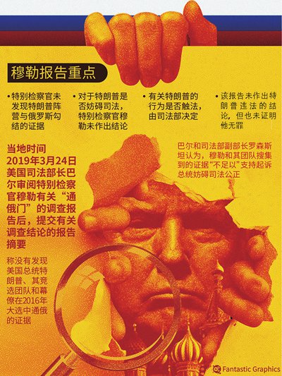 当地时间24日晚,司法部长威廉·巴尔发表声明称,根据穆勒的调查报告,并未发现特朗普竞选团队在2016年大选中有“通俄”之实;以目前掌握的证据,不足以证明他有罪。报告一公布,特朗普就迫不及待地发推文称,这是给他的“无罪证明”。不过,巴尔在写给国会的信中表示,穆勒的报告“既未证明总统有罪,也没替他开脱”。