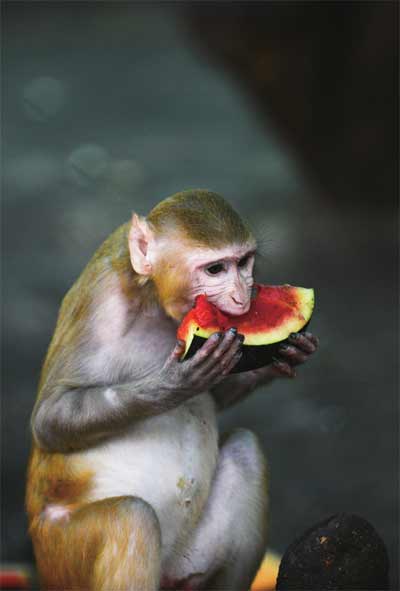 印度气象部门4月26日发布了未来3天的“红色预警”,古吉拉特邦许多地区受到高温冲击。在艾哈迈达巴德市,民众躲进室内“冰雪世界”玩雪,动物园里的猴子吃瓜消暑。