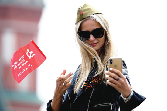 5月9日,莫斯科市民在卫国战争胜利日纪念活动中自拍。