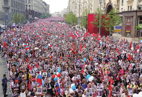 5月9日,人们高举一张张遗像走上莫斯科街头,纪念在二战中死去的亲人。
