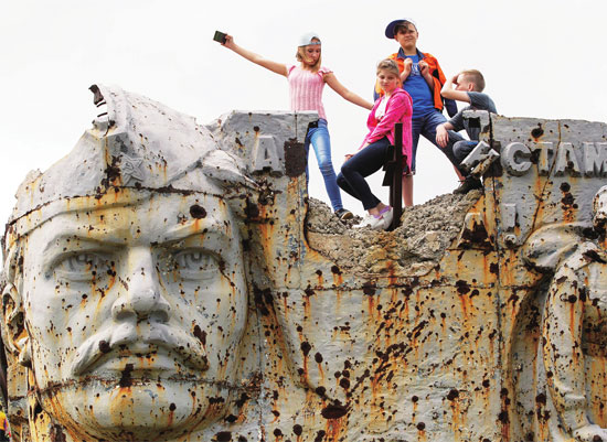 5月8日,在俄罗斯卫国战争胜利日前夕,顿涅茨克民众参观战争纪念雕塑。这些雕塑在不久前的乌克兰东部冲突中受损。