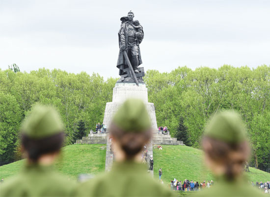 5月9日,人们在德国柏林的苏维埃战争纪念碑前举行活动,纪念苏联战胜纳粹德国74周年。在苏军攻克柏林的激战中身亡的7000名苏军官兵被安葬在此处。
