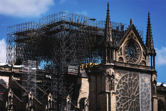 5月12日,脚手架组成了巴黎圣母院的新“屋顶”。当天,法国议会下院通过了修复巴黎圣母院的法案,内容包括向为修复巴黎圣母院捐款的人提供税收优惠。图片来源 视觉中国
