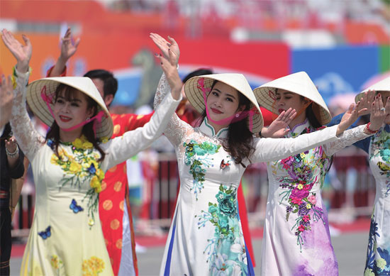 5月16日,来自越南的演员在亚洲文明巡游活动中表演。当日,亚洲文明巡游活动在北京奥林匹克公园庆典广场拉开帷幕。巡游活动设有“中华风采”“亚洲风情”“神州风韵”“北京欢迎你”四大表演板块。图片来源 新华社