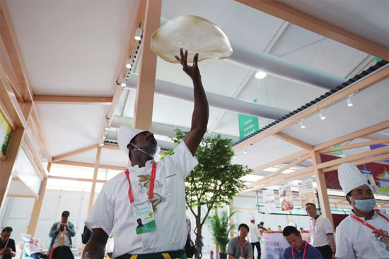5月16日,来自印度的厨师拉姆在制作印度飞饼。当天开幕的亚洲美食节是亚洲文明对话大会的活动之一,通过美食文化盛宴展示绚丽多姿的亚洲文化风情和亚洲文明风采,使公众尽享亚洲各国美食。图片来源 新华社