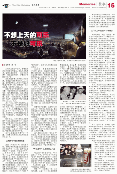 二战后,美国航空航天局(NASA)登场了。在超级大国太空争霸的高潮时期,每次航天发射都会吸引全世界的眼球,商家自然不会错过搭车的机会。《大西洋月刊》称,早在1966年,乘坐美国第一代“双子座”飞船的宇航员就喝上了橙味冲剂饮料“唐橙”。随着航天飞机在上世纪80年代实用化,大公司纷至沓来。
