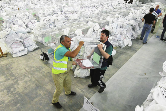 5月24日,希腊塞萨洛尼基的工作人员在搬运投票箱。