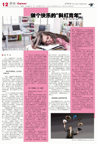 “我在工作中要扮演众多角色:作者、发言人、领导、咨询顾问、董事……这些角色有时压得我喘不过气来。现在,越来越多的人开始身兼数职,每个职位都有不同的职责。人们通常希望把每个角色都扮演得淋漓尽致,但太多的职责有时会让我们应接不暇,总会让某些人失望。”肯塔基大学教务处长、管理学教授克里斯丁·赖尔登告诉美国《哈佛商业评论》杂志,“同时,身兼数职会造成角色冲突,使人每天都感到压力和束缚。每份工作都牵扯你的精力,常常顾此失彼。研究表明,多种工作之间的冲突会给人带来巨大的压力,这种压力不仅会影响当事人,还会影响他身边的人。因为,我们掩藏不了筋疲力尽的神态,别人看到了,心情也会受到影响。”
