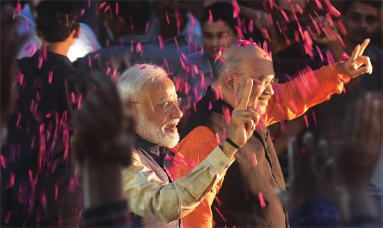 5月23日,印度民众向莫迪(左)抛撒花瓣,庆祝他赢得连任。图片来源 视觉中国