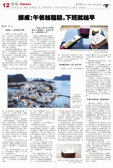 “如果中午休息时间太长,下班时间就会变得更晚。挪威是一个地域狭长的国家,又有漫长的极夜,最好在天黑前结束一天的工作。挪威人并不比其他国家的人更聪明,但我们知道,上班就是去工作,不该把时间花在和同事扯闲篇儿、约会、吃饭这些事儿上。”霍尔姆说。