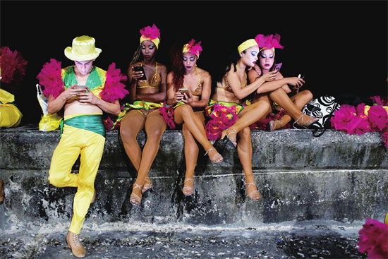 2017年8月18日,古巴狂欢节期间,舞者们在哈瓦那用手机上网。图片来源 视觉中国
