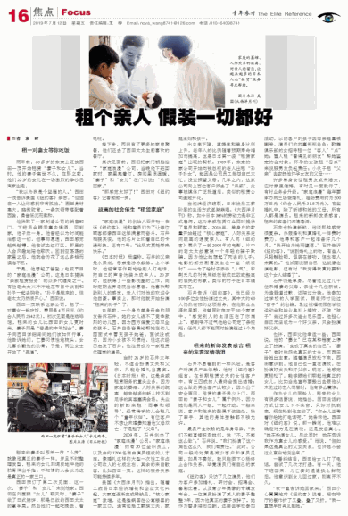 于是,他想起了曾登上电视节目的“家庭浪漫”公司,这是日本提供“亲戚租赁服务”的众多代理商之一。有位老太太兴冲冲地在节目中谈到和孙子一起去购物。“孙子是租来的,但老太太仍然很开心。”西田说。