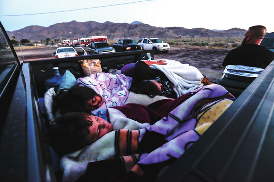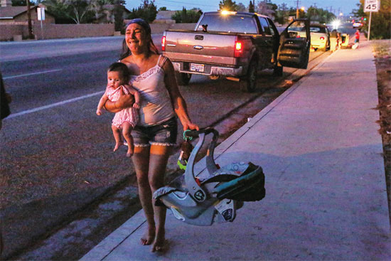 7月5日,加州里奇克莱斯特的一位母亲抱起孩子出门避难。