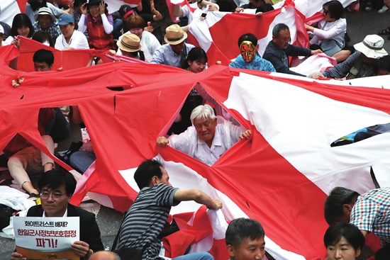 7月20日,韩国民众在首尔的日本大使馆前撕毁一面巨大的日本军旗。图片来源 视觉中国