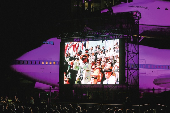 7月20日,在美国休斯敦太空中心,大屏幕上展示着50年前人们观看“阿波罗11号”发射升空的场面。