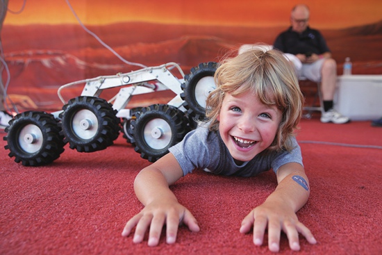 7月19日,美国华盛顿的史密森尼国家航空航天博物馆举办登月主题展,一名萌娃在展览中体验科技魅力。