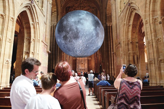 7月6日,英国艺术家卢克·杰拉姆的巡回艺术作品“月亮博物馆”在英国舍伯恩一座修道院展出。直径7米的“月球”表面是美国国家航空航天局拍摄的月球高清图像。