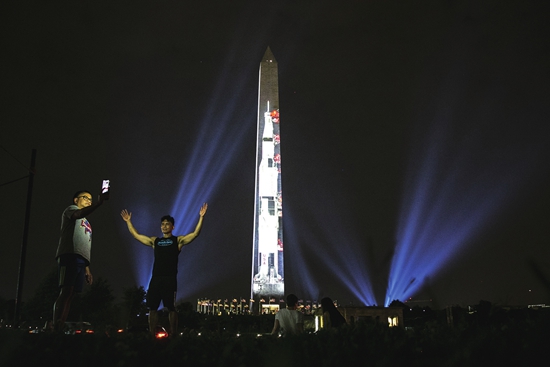 7月19日晚,美国华盛顿纪念碑上演“阿波罗50年:前进月球”灯光秀。