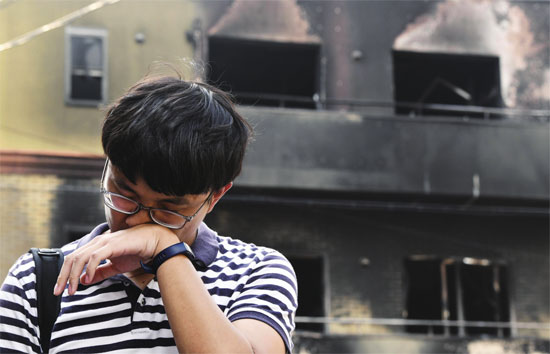 大火熄灭后,狰狞的黑色伤疤爬满这栋淡黄色的小楼。消防员在1楼找到两具尸体,在2楼找到11具。通往3楼的楼梯上尸体最多,有20具。消息传出,多地的动漫迷在次日冒着细雨,来到被警戒线围住的工作室前致哀。菊花与百合在地上堆成小丘,有人摆上了心爱的漫画。