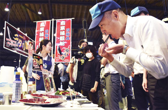 7月8日,重启商业捕鲸后的第一批鲸肉,在大坂市一家大型百货公司上架。每100克生鱼片售价599日元(约合人民币39元),提供免费试吃。“肉是甜的,没有气味,勾起了我对学校食堂的记忆。”58岁的大坂人西冢雅明对《日本时报》说。
