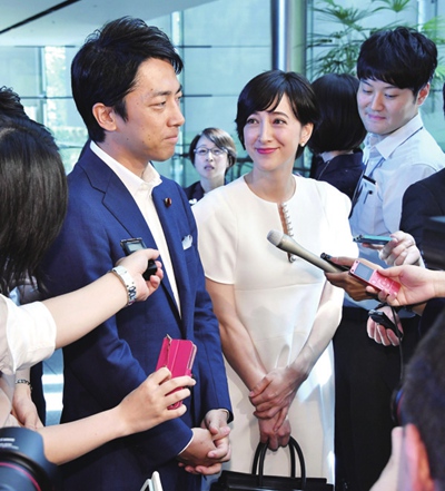 8月7日,小泉进次郎和妻子被媒体记者包围。图片来源 视觉中国