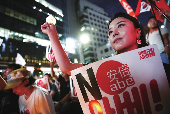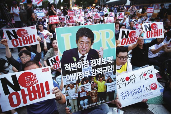 8月10日,韩国民众在首尔的日本使馆前举行“谴责日本安倍政府的1000名青少年宣言大会”。