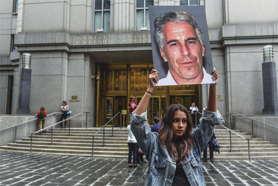7月8日,在纽约的联邦法院门前,一名抗议者高举爱泼斯坦的照片,要求彻查他涉嫌招募少女进行性交易的案件。图片来源 视觉中国