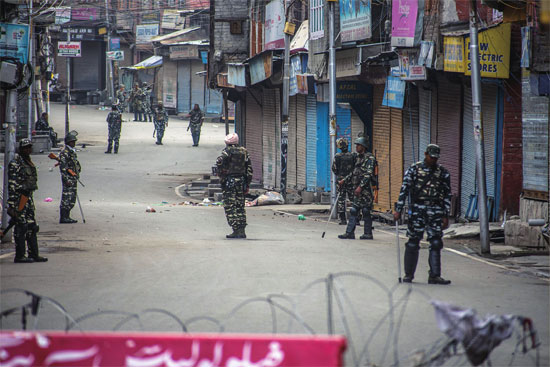 8月15日,斯利那加街头,印度安全部队在警戒。图片来源 视觉中国