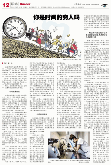 “没时间”这个问题长期困扰着全世界的职场中人,尤其是管理人员,而且有越来越严峻的趋势。所谓的“有闲阶级”从未像现在这样烦恼——如今,职业人士的受教育程度越高,加班加点的可能性越大。现代午餐往往是高效率的,一边坐在办公桌前狼吞虎咽,一边盯着电子邮件。即使离开办公室,智能手机的鸣叫仍然随时提醒人们,工作永远不会结束。许多人抱怨,这些为了节省时间而发明的新玩意占用了他们太多时间,让他们即便在堵车时也不停地收听语音留言、收发电子邮件。