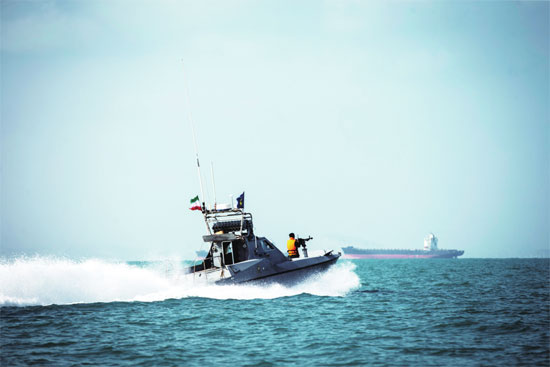 8月22日,在伊朗阿巴斯港,伊朗伊斯兰革命卫队的船只靠近一艘悬挂英国国旗的油船。图片来源 视觉中国