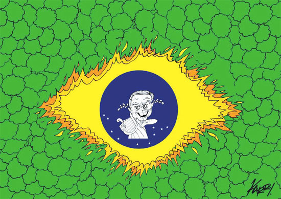 亚马孙热带雨林连续三周大火,场面如同地狱,巴西总统博索纳罗却表示“一切正常”。愤怒的漫画家把他画成了古罗马暴君尼禄,据传后者曾在罗马城大火时登上高塔,弹琴高歌……