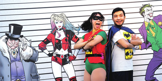 9月21日,两名粉丝在美国洛杉矶与《蝙蝠侠》漫画中的反派角色合影。