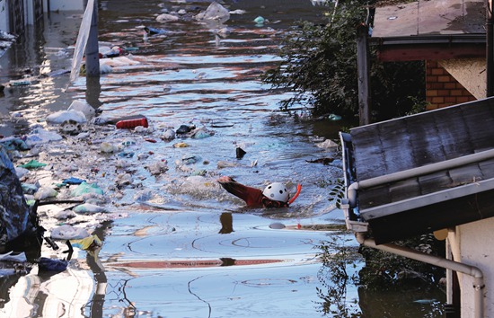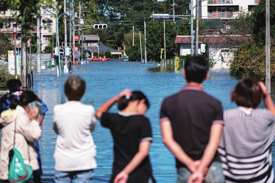 10月13日,救援人员在神奈川县川崎市被淹没的居民区中搜寻被困者。
