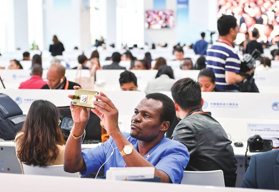 11月5日,各国媒体记者在第二届进博会新闻中心内抢发新闻。