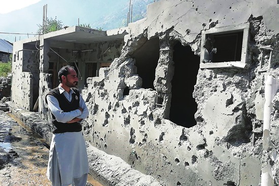 10月20日,克什米尔地区若拉村的村民站在受炮火波及的房屋前。当天,印度和巴基斯坦在克区发生了交火。图片来源 视觉中国