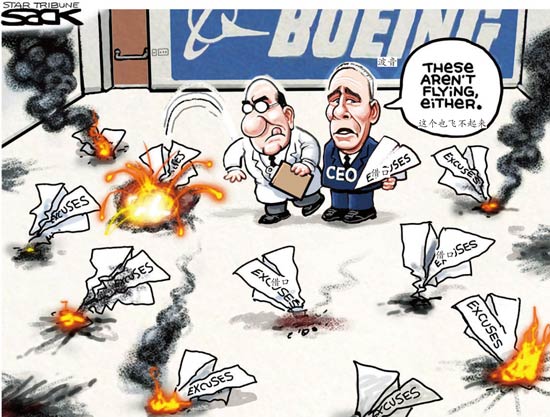 坏消息不止于此:波音一位退休工程师实名举报波音787“梦幻客机”有安全隐患,数十架737 NG飞机被发现有裂缝紧急停飞检修……对此,波音首席执行官丹尼斯·米伦伯格只是在美国国会承认“犯了错”,回避谈论事故的深层次原因。