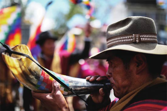 11月18日,玻利维亚印第安人在拉巴斯的抗议活动中吹响号角,表示对莫拉莱斯的支持。莫拉莱斯是玻利维亚第一位印第安人总统。