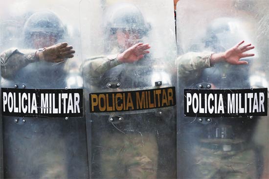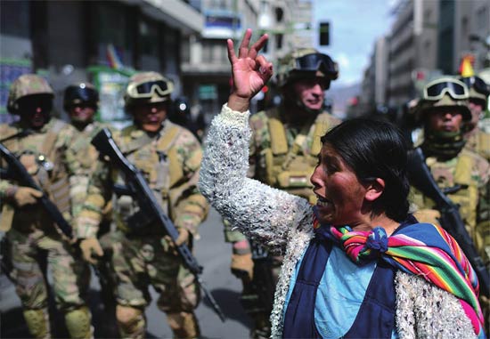 11月14日,玻利维亚军警在首都拉巴斯警戒。当天,莫拉莱斯的支持者在街头抗议。