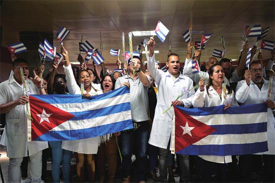 11月16日,古巴医护人员手持古巴国旗,在哈瓦那的机场等待同胞从玻利维亚归国。受玻利维亚政治动荡影响,古巴宣布终止其在玻利维亚的医疗任务。
