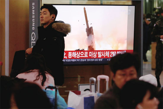 11月28日,韩国电视节目播放朝鲜进行实弹射击的新闻。图片来源 视觉中国