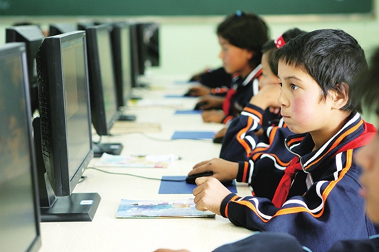 海尔希望小学学生在海尔爱心电脑教室中学习计算机知识。