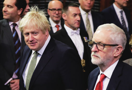 英国首相约翰逊(前左)与工党领袖科尔宾一同出席议会开幕仪式。不久前的大选中,科尔宾领导的工党惨败,约翰逊带领保守党赢得了下院多数席位。