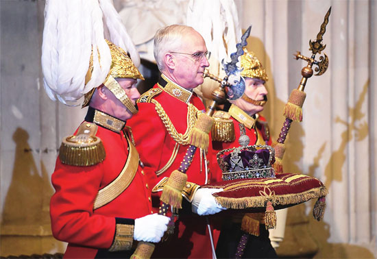 英国王室侍卫在议会开幕仪式上递送王冠。