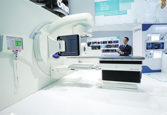 2019年11月7日,第二届中国国际进口博览会上,瑞典医科达公司新一代人工智能放疗平台“Elekta Axesse”参展。 图片来源 新华社