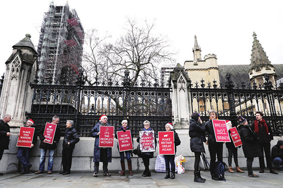 2019年12月19日,英国女王伊丽莎白二世宣布,英国新政府将把在2020年1月31日完成“脱欧”作为优先任务。当日,“脱欧”支持者在位于伦敦的英国议会大厦外手举标语牌庆祝。图片来源 新华社