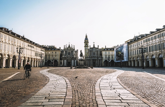 4月4日,意大利都灵,一名男子骑车经过空旷的广场。意大利新冠疫情应急委员会专员博雷利5日宣布,该国实施近一个月的全国管控措施正在起效,但绝不能放松警惕。当天,意大利新增死亡病例525例,为3月20日以来的最低值。图片来源 新华社