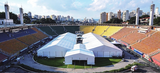 3月27日,建在巴西圣保罗市帕卡恩布体育场的“方舱医院”即将投入使用。当天,拉美地区新冠肺炎确诊病例超过1万例,其中超过2000例在巴西。
