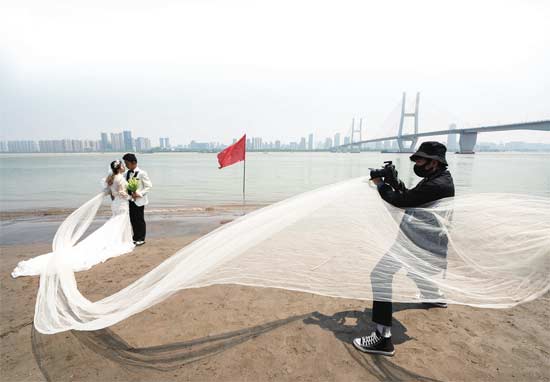 4月12日,一对新人在武汉江滩公园拍摄婚纱照。图片来源 新华社