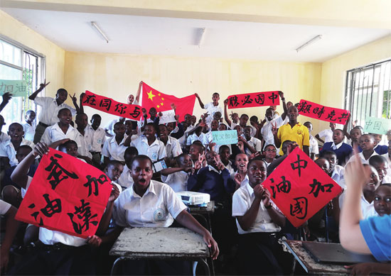 新冠疫情期间,坦桑尼亚达累斯萨拉姆大学孔子学院中学部学生为中国加油。图片来源 作者提供